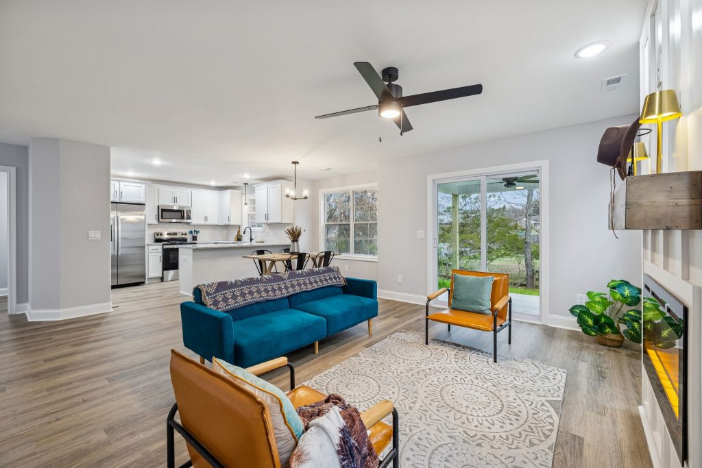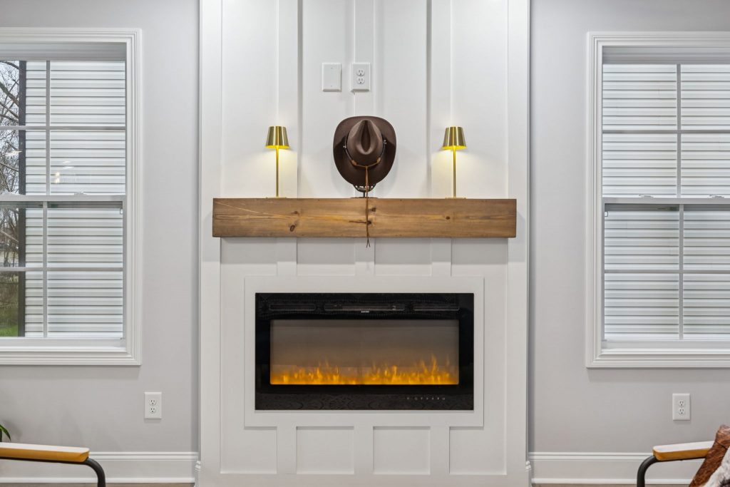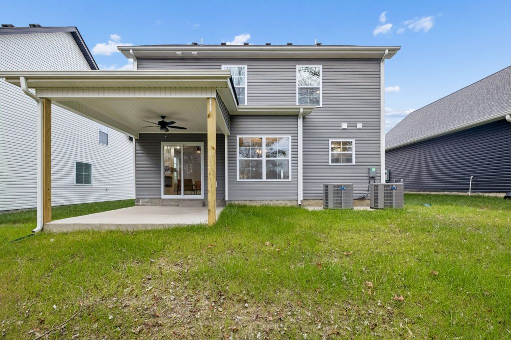 Thoughtful upgrades include granite countertops, an electric fireplace with a shiplap surround, a covered back patio, and a wired security system—details that enhance both comfort and peace of mind.